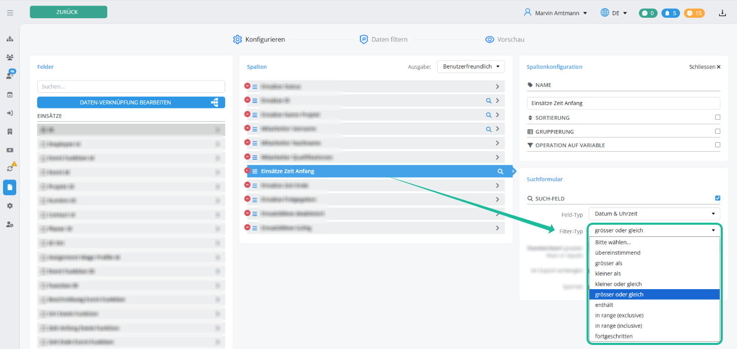 | System Stati z.B. Einsatzstatus, Mitarbeiterstatus, ... | ⚠️ Auswählen (Dropdown) ✅ Mehrauswahl | ❌ übereinstimmend ✅ in (funktioniert in diesem Fall wie "Mehrauswahl") ❌ fortgeschritten |