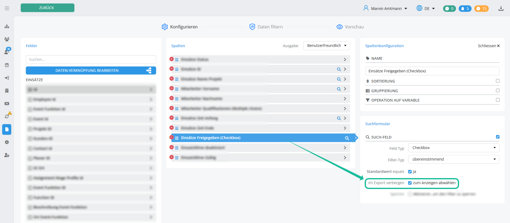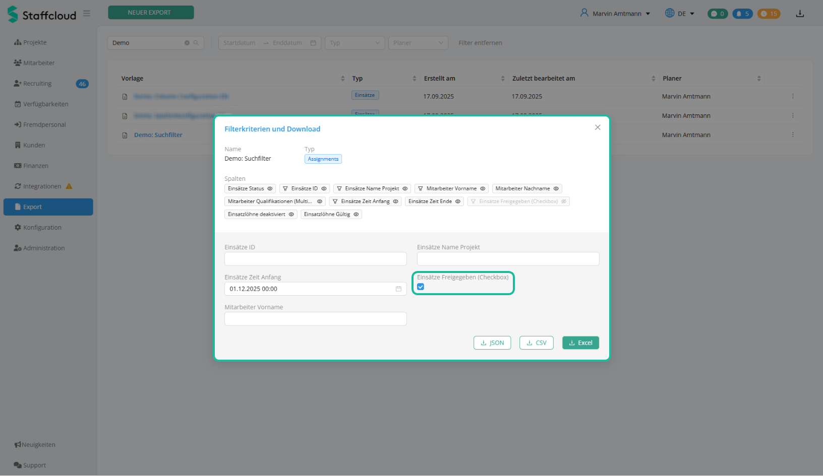 In Staffcloud ist es möglich, Datenfelder als Filter zu verwenden, ohne sie als Spalte im Export auszugeben. So können Sie z. B. nach dem Einsatzstatus oder Zeitraum filtern, ohne diese Informationen im finalen Export anzuzeigen.