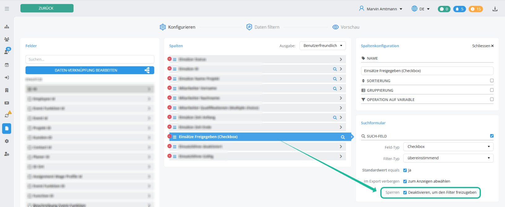 Um einen Filter zu sperren, aktivieren Sie die Checkbox im Suchformular der Exportkonfiguration und speichern Sie die Exportvorlage.